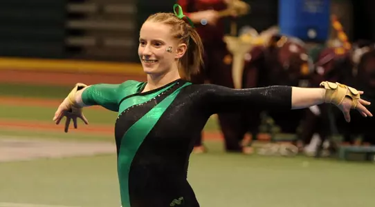 In true fashion senior Nikole Viltz (Hawthorn Woods, Ill.- Carmel) led the Green and White finishing first on both the vault and balance beam recording a 9.850 and 9.700 respectively. Viltz also finished tied for fourth on the floor exercise posting a 9.650.