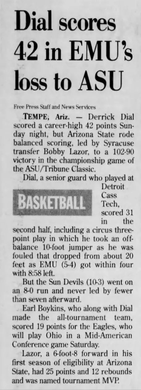 Eastern won the game, 99-82. Dial, who also scored 42 against Arizona State in 1997, ended up as Eastern's third-leading scorer and No. 11 all-time rebounder.