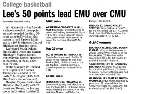On the men's side, the 40-point threshold has been broken 12 times, but just one player, Ray Lee, has broken the 50-point barrier. Alternately known as "Raven" during his EMU career, Lee hit for 50 in a 109-81 win at Central Michigan in 2017. Lee broke Eastern's record for 3's in that game (10), and his 17 field goals were fourth-best in a single game. His 26 first half points nearly eclipsed the Chippewas, who trailed Eastern, 54-29.