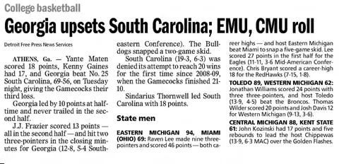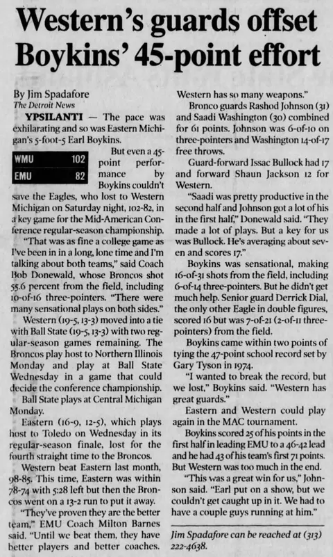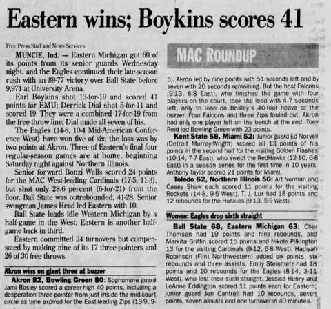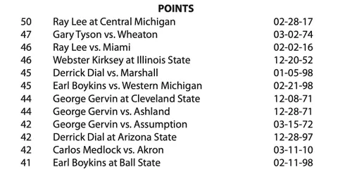 Earl Boykins makes the list twice, for a 41-point night at Ball State and a 45-point effort against Western Michigan. Boykins is the only player on the list in a loss; his 45-point effort came in a 102-82 loss, ironic because no EMU player won more games (87) than Earl the Squirrel. His No. 11 was retired in 2011.