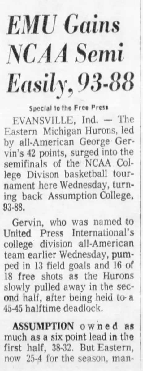 George Gervin, named one of the NBA's 50 greatest players in 1996 in celebration of the league's 50th season, is found three times on Eastern's Top 10 single game scoring list. One such effort, his 42-point night against Assumption, helped Eastern advance to the NAIA Final Four, one day after Gervin was named a First Team All-American.