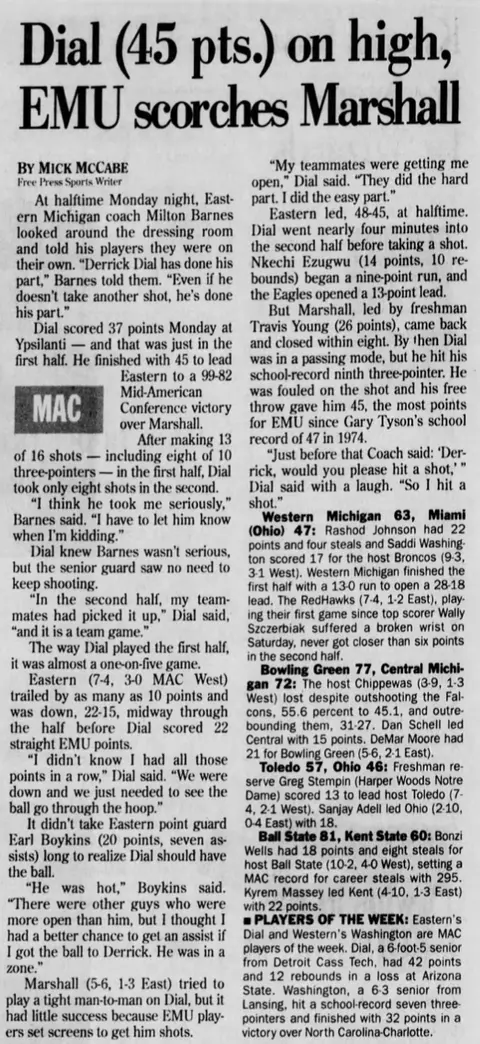 I was fortunate to witness Derrick Dial's 45-point effort January 5, 1998 at Bowen Field House against Marshall. Remarkably scoring 38 in the first half, Dial did most of his damage in just 10 minutes, when he rattled off 22 straight with EMU was trailing, 22-15 at the midway point of the period!