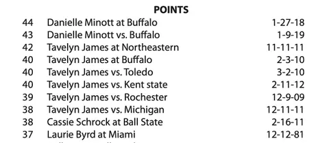 Sometimes, the hot hand dictates you shoot more than your teammates. On the women's side, Danielle Minott and Tavelyn James dominate the single-game scoring list. Minott, a 5-foot-8 guard from Miami who transferred to EMU from Syracuse, scored 44 at Buffalo in 2018, and hit for 43 against Buffalo year later to set the Convocation Center record.