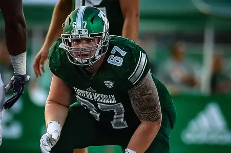 EMU: 2018: Appeared in 13 games for the Eagles, earning 12 starts at left guard…2017: Played in all 12 games on the offensive line for the Eagles...Started 10 of the 12 at left guard, including a stretch of seven straight leading to the end of the season...2016: Played in the final four games of the year...2015: Appeared in 10 games for the Green and White, garnering two starts on the offensive line...2014: One of the 2014 recruits who sat out the season as a redshirt...HIGH SCHOOL: Attended Brother Rice High School in Bloomfield Hills, Mich...Played under legendary Head Coach Al Fracassa as a Warrior...A late bloomer ranked as a two-star recruit by Scout.com...Received honorable mention all-league honors...Helped his team capture its third-straight Division II state title in 2013 with a 14-0 record...First perfect season at Brother Rice since 1983...PERSONAL: Full name: Jeremy Michael Hickey...Son of Mary and Michael Hickey...Has two brothers, Jacob and Bryan, and two sisters, Maria and Michelle...Social studies and history double major.