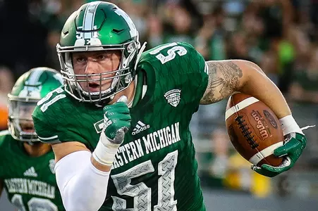 EMU: EMU: Finished his Eastern Michigan career with 347 tackles, the ninth-most by any Eagle…2018: Named Second Team All-MAC Selection at linebacker...Started all 13 games for the Eagles in his senior year at linebacker...Finished the season pacing the Eagles with 127 tackles, 10 tackles-for-loss, five quarterback hurries, two sacks, two interceptions and a forced fumble...Nabbed his season’s two interceptions against Monmouth (Aug. 31) and Northern Illinois (Sept. 29)...Had a season-high 16 tackles against the Huskies (Sept. 29)...Marked six games with 10 or more tackles at Purdue (Sept. 8, 11), NIU (Sept. 29, 16), Toledo (Oct. 13, 11), Army (Oct. 27, 14), Central Michigan (Nov. 3, 10), and Kent State (Nov. 23, 13)...One of just 17 Eagles in program history to join the 300+ career tackle club...Led all Eagles defenders with 12 tackles against Georgia Southern in the 2018 Raycom Media Camellia Bowl (Dec. 15)… Selected Fourth Team Preseason All-MAC by Athlon Sports...Selected as team captain for the Eagles' 2018 campaign…2017: Helmet Stickers Winner at the postseason banquet...Saw action in all 12 games on the season...Finished the season with 67 tackles on the season to go along with 6.5 TFLs...Had a 12 tackle outing (4 solo, 8 assist) against Army West Point (Oct. 14)...Had a 27-yard carry against Western Michigan (Oct. 21)...Forced two fumbles in game against Northern Illinois (Oct. 26)...Selected Fourth Team Preseason All-MAC by Athlon Sports...2016: Started 10 games and played in all 13...Led the team with 109 tackles on the season...Registered a season-high 13 tackles twice against Western Michigan (Oct. 22) and Central Michigan (Nov. 22)...Snagged his second career interception against Northern Illinois (Nov. 16)...2015: Appeared in nine games for the Green and White, starting two... Recorded 44 tackles on the season, highlighted by a career-high 14 versus UMass (Nov. 14)...Registered one interception on the season, returning it 35 yards for a touchdown versus CMU (Nov. 27)... Recovered a fumble versus Ball State (Sept. 19) and forced one against Miami (Nov. 7)...Recorded his first career sack against UMass (Nov. 14), resulting in a loss of four yards...Finished his first season with 6.5 TFL’s for a combined 19 yards...2014: One of the 2014 recruits who sat out the season as a redshirt with freshman eligibility in 2015...HIGH SCHOOL: Attended Lapeer East High School in Lapeer, Mich...Played under Head Coach Jake Weingartz as an Eagle...Received three stars from 247sports.com...Listed as the 69th-best middle linebacker in the nation (second-best in the state of Michigan) and a two-star recruit by Scout.com...Played both middle linebacker and running back...Headlined The Flint Journal’s Dream Team for defense as the Player of the Year...As a senior, racked up 109 tackles and four interceptions on defense, and returned two of those picks for touchdowns...On the offensive side, scored 16 rushing touchdowns with 812 yards on 92 carries...Caught 23 passes for 333 yards...Selected to play in the Michigan versus Ohio All-Star Football Game on June 14 in Findlay, Ohio, with the top-40 high school seniors in the state...PERSONAL: Full name: Kyle Albert Rachwal...Son of Sandy and Steve Rachwal...Has one brother, Sean...Graduated in four years with a degree in communication and is now working toward a Master's degree in Autism Spectrum Disorder.